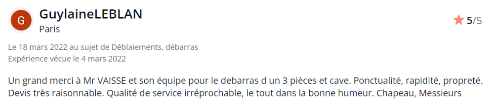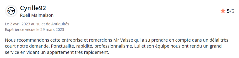 " Excellent contact. Ponctualité. A l’écoute. Débarrasser l’appartement après le décès de notre mère, était une épreuve. Monsieur Vaïsse a su nous faciliter la tâche, avec son équipe sympathique. Nous recommandons vivement cette entreprise."