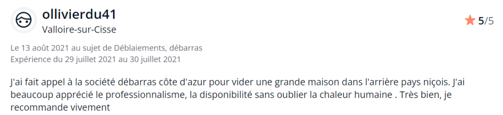 "J'ai fait appel à la société débarras côte d'azur pour vider une grande maison dans l'arrière pays niçois. J'ai beaucoup apprécié le professionnalisme, la disponibilité sans oublier la chaleur humaine . Très bien, je recommande vivement"